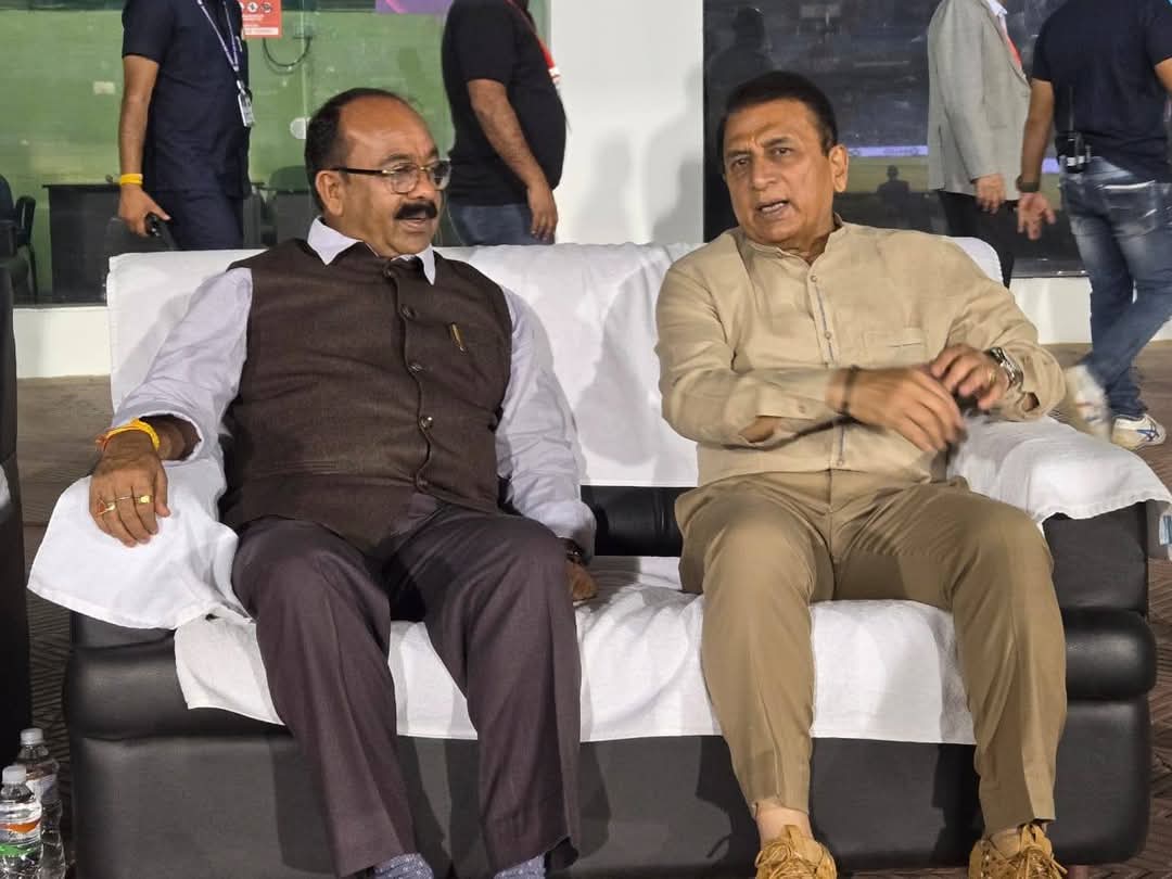 फोटो : मैच के दौरान चर्चा करते उपमुख्यमंत्री अरुण साव एवं पूर्व भारतीय क्रिकेटर सुनील गावस्कर