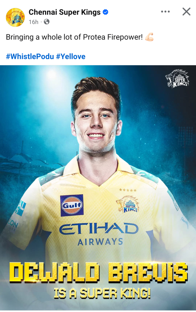 चेन्नई/आईपीएल ने एक आधिकारिक बयान में कहा गया, ‘चेन्नई सुपर किंग्स (CSK) ने टाटा इंडियन प्रीमियर लीग (IPL) 2025 के शेष मैचों के लिए चोटिल गुरजपनीत सिंह की जगह दक्षिण अफ्रीका के डेवाल्ड ब्रेविस को अनुबंधित किया है. डेवाल्ड ब्रेविस ने 81 टी20 खेले हैं और 162 के उच्चतम स्कोर के साथ 1787 रन बनाए हैं. उन्होंने 2023 में दक्षिण अफ्रीका के लिए अपना टी20 आई डेब्यू किया और अब तक 2 टी20 आई खेले हैं. ब्रेविस पहले मुंबई इंडियंस (MI) का हिस्सा थे, जहां उन्होंने 10 मैच खेले थे. वह सीएसके में 2.2 करोड़ रुपये में शामिल होंगे.’
