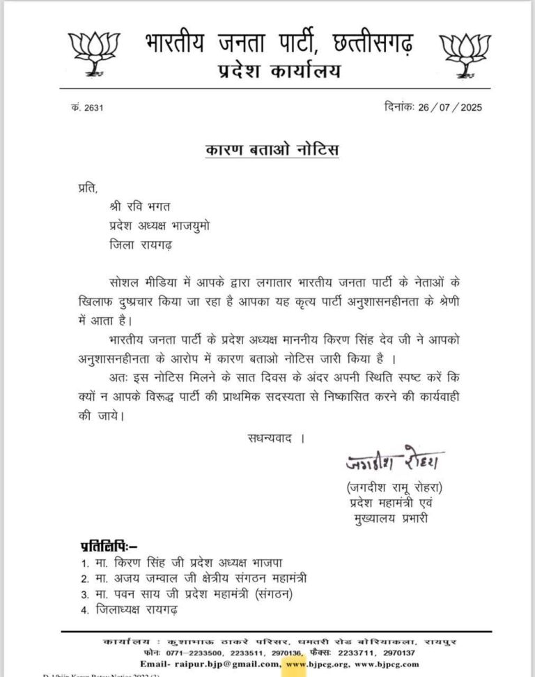 राजधानी रायपुर/ सत्य का सामना /भारतीय जनता पार्टी छत्तीसगढ़ प्रदेश द्वारा युवा मोर्चा के प्रदेश अध्यक्ष रवि भगत को कारण बताओ नोटिस जारी किया गया है l प्रदेश अध्यक्ष किरण सिंह देव ने उन्हें भारतीय जनता पार्टी के नेताओं पे सोशल मिडिया के माध्यम से दुष्प्रचार का आरोप लगाया है और इस नोटिस मे यह साफ उल्लेख किया गया है की उन्हें क्यों न पार्टी के प्राथमिक सदस्यता से निष्कासित किया जाये सात दिनों के भीतर उन्हें जवाब देने कहा गया है…
