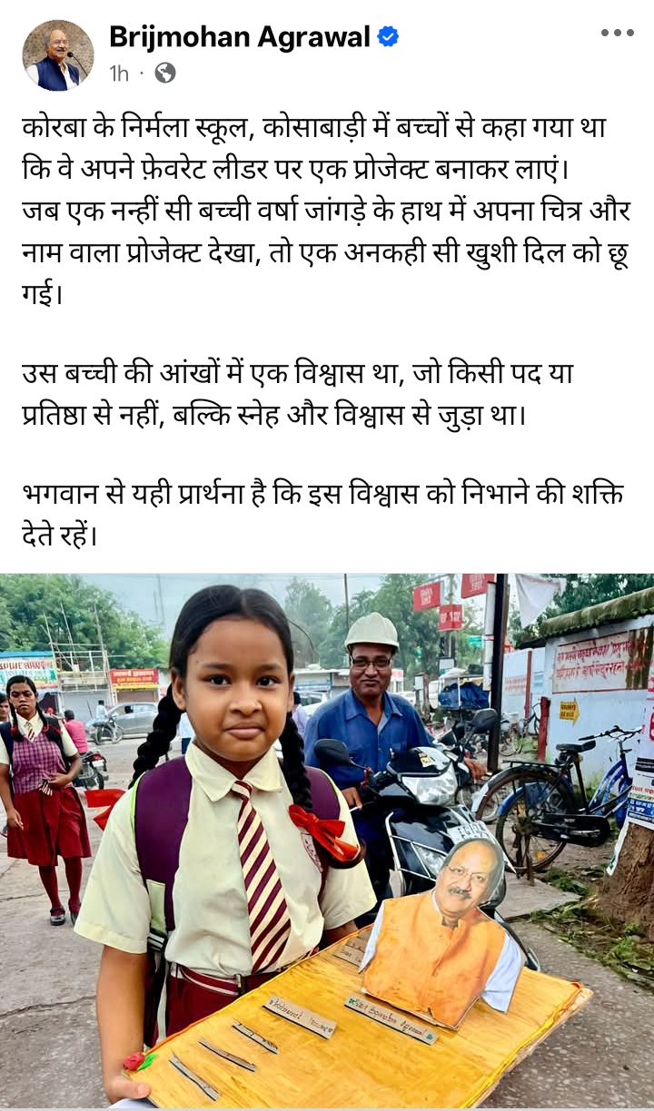 आज हम कोरबा की एक नन्ही से बच्ची की बात करने जा रहे है जो कोरबा के निर्मला स्कूल में पढ़ाई करती है, टीचर ने उन्हें अपने फेवरेट लीडर का प्रोजेक्ट बनाने कहा उस नन्ही सी बच्ची वर्षा जांगड़े ने सांसद बृजमोहन अग्रवाल की प्रोजेक्ट बनाई जिसे सांसद ने सराहना अपने सोशल मिडिया अकाउंट में शेयर किया है….