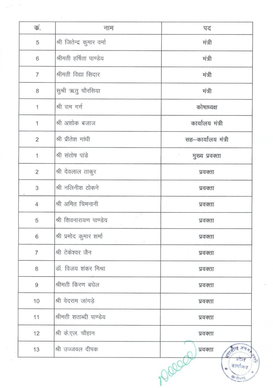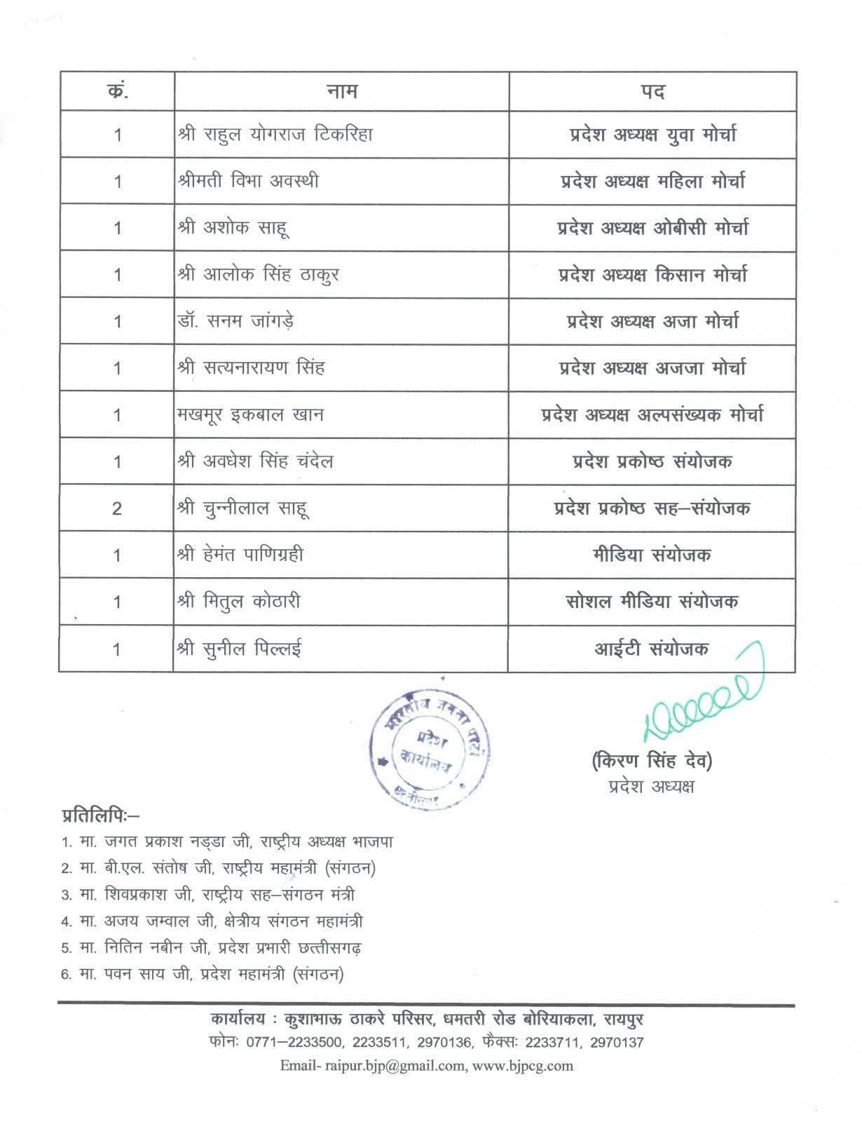 वही युवा मोर्चा में प्रदेश अध्यक्ष के रूप में राहुल टिकरिहा मौका दिया गया हैँ, महिला मोर्चा में प्रदेश अध्यक्ष विभा अवस्थी के नाम पर मुहर लगी हैँ वही अल्पसंख्यक मोर्चा से मखमूर इक़बाल खान को प्रदेश की जिम्मेदारी सौपी गई हैँ…..