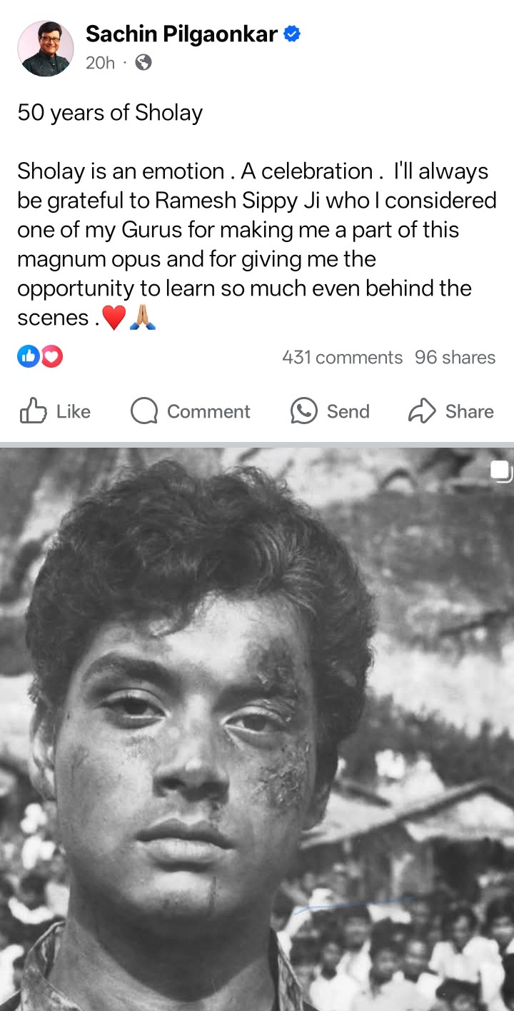 ब्लॉकबस्टर फ़िल्म शोले के 50 वर्ष हुए पुरे, अभिनेता सचिन ने सोशल मिडिया में तस्वीर साझा की….. इंटरटेनमेंट 16 August 2025satyakasamnaLeave a Comment on ब्लॉकबस्टर फ़िल्म शोले के 50 वर्ष हुए पुरे, अभिनेता सचिन ने सोशल मिडिया में तस्वीर साझा की….. मुंबई / सत्य का सामना / ब्लॉकबस्टर फ़िल्म “शोले ” के 50 वर्ष पूर्ण होने पे अभिनेता सचिन ने तस्वीर शेयर की है जिसमें निर्देशक रमेश सिप्पी, अमिताभ बच्चन, धर्मेंद्र, ए. के, हंगल तस्वीर में नजर आ रहे है.. Post Views: 63