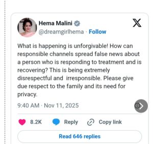 हेमा मालिनी ने गलत खबर फैलाने वाले चैनल्स को फटकार लगाई है। उन्होंने एक्स पर पोस्ट करते हुए लिखा- ‘जो हो रहा है वह माफ़ करने लायक नहीं है! ज़िम्मेदार चैनल एक ऐसे इंसान के बारे में झूठी खबरें कैसे फैला सकते हैं जो इलाज का जवाब दे रहा है और ठीक हो रहा है? यह बहुत ही अपमानजनक और गैर-जिम्मेदार हरकत है। कृप्या परिवार और उनकी प्राइवेसी की ज़रूरत का सम्मान करें.