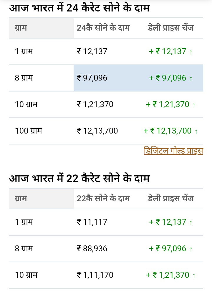 नई दिल्ली /सत्य का सामना / क्या अगर आप सोने में इन्वेस्टमेंट करना चाहता है या शादी के लिए खरीदने के लिए मूड बना रहे है तो सबसे पहले आपको 24 कैरट और 22 कैरट के सोने के दाम के सही मूल्यों का पता होना जरूरी है। देश में आज सोने के 24 कैरेट के 1,21,370 वही 22 कैरेट के दाम 1,11,170 रूपये है सभी दामों को अपडेट किया गया है। ये इंडस्ट्री के स्टैण्डर्ड के अनुसार है…