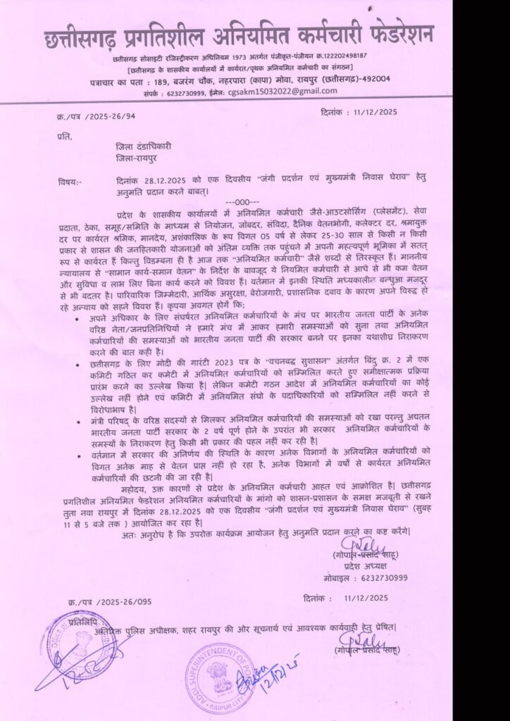 रायपुर राजधानी /डिजिटल नेटवर्क /सत्य का सामना / छत्तीसगढ़ अनियमित कर्मचारी फेडरेशन ने अपनी लंबित मांगों को लेकर 28 दिसंबर को राजधानी रायपुर में जंगी प्रदर्शन करने का ऐलान किया है।