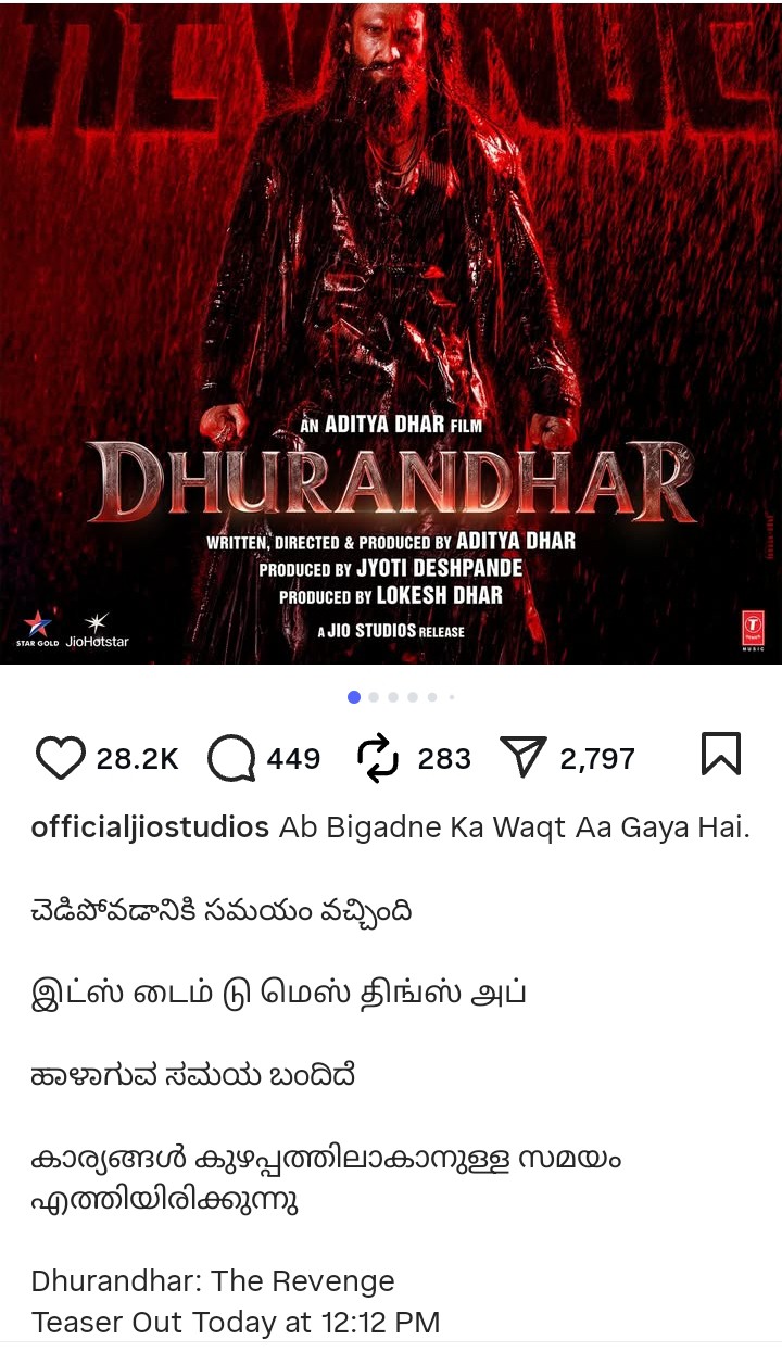 हमेशा की तरह रणवीर सिंह ने धुरंधर को लेकर इंस्टाग्राम पे एक क्रिप्टिक पोस्ट किया जिसमें “धुरंधर 2” के ट्रेलर को लेकर हिंट दिया गया है। फैंस उत्साहित होकर इस पोस्ट के बारे में अटकले लगा रहे है। धुरंधर के समय भी रणवीर कुछ इस तरह ही पोस्ट करते थे तब से ही फैंस इस पोस्ट को लेकर काफ़ी उत्साहित है….