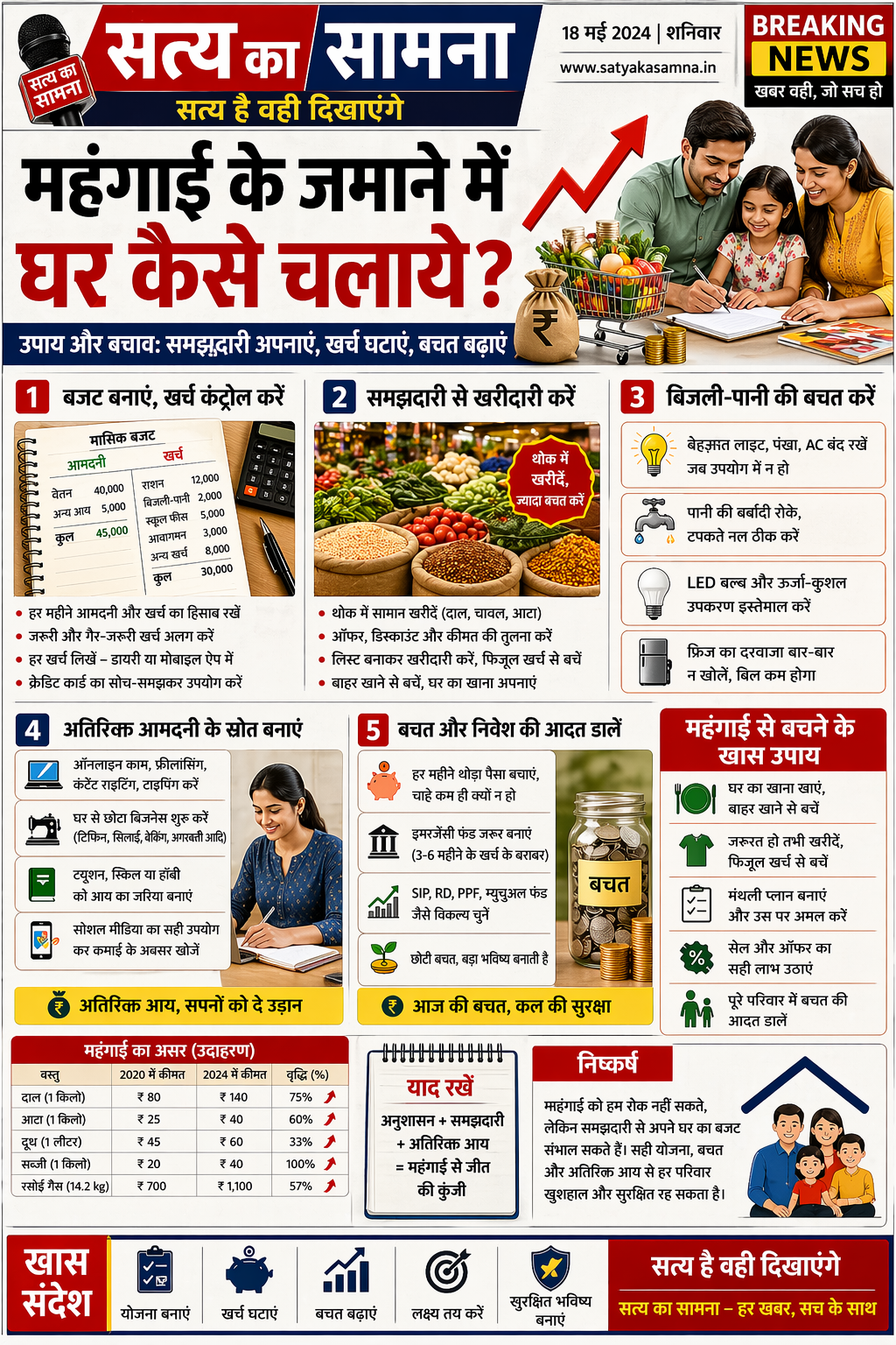 सत्य का सामना। न्यूज़ नेटवर्क। महंगाई के जमाने में निम्न एवं मध्यवर्गीय परिवारों को घर चलाने में बड़ी मुश्किलों का सामना करना पड़ता है ऐसे में अगर कुछ कदम सोच समझकर उठाया जाए तो यह संभव है लिए जाने कम बजट में घर चलाने के मुख्य टिप्स:
