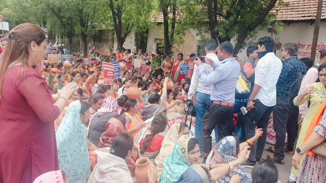 शराब बंदी के लिए मुकरने पर भाजपा महिला मोर्चा ने मंत्री अकबर के बंगले के सामने धरना कर बँगले का घेराव किया इस दौरान बड़ी संख्या में महिला मोर्चा की पदाधिकारी कार्यकर्ता मौजूद थे महिला मोर्चा अपने साथ पानी के मटके साथ मे लाये थे उन्होंने उसे वही फोड़ कर अपना विरोध जताया । प्रदर्शन के दौरान महिला मोर्चा के कार्यकर्ताओं का महिला पुलिस के साथ झूमाझटकी नोकझोंक हुई । महिला मोर्चा अध्य्क्ष शालिनी राजपूत के नेतृत्व में भारत माता चौक से मन्त्री अकबर के बंगले तक जुलुस निकाला गया ।
