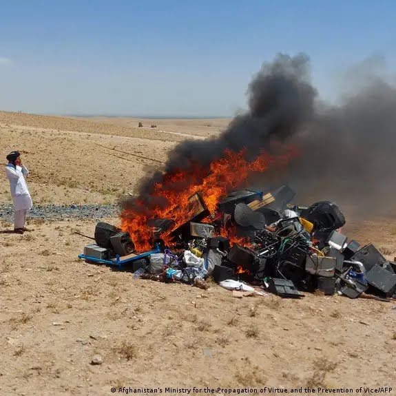 अफगानिस्तान में गिटार, तबला, हारमोनियम को आग में फूंक दिया दिया है आग में धु धु करते हुए यह दृश्य हेरात प्रांत का है तालिबान में प्रान्त के कई विद्यालय ओर ओर मैरिज हाल से से जब्त किए गए वाद्ययंत्रों को सार्वजनिक रूप से आग लगा दिया है और उन्होंने कहा कि संगीत से चरित्र ख़राब होता है इससे युवा भटक जाएंगे ….