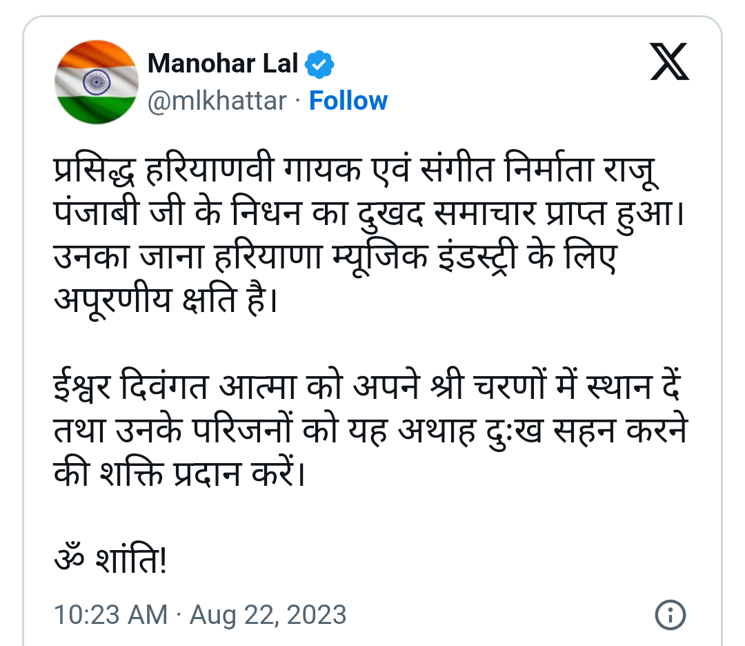 हरियाणा के मुख्यमंत्री मनोहर लाल खट्टर ने भी राजू पंजाबी के इस अचानक निधन पर काफी दुख जताया है। जहां हरियाणा के मुख्यमंत्री मनोहर लाल खट्टर ने अपने ट्वीट में लिखा की “प्रसिद्ध हरियाणवी गायक एवं संगीत निर्माता राजू पंजाबी जी के निधन का दुखद समाचार प्राप्त हुआ। उनका जाना हरियाणा म्यूजिक इंडस्ट्री के लिए अपूरणीय क्षति है। ईश्वरउनकी आत्मा को अपने श्री चरणों में स्थान दें तथा उनके परिजनों को यह अथाह दुःख सहन करने की शक्ति प्रदान करें” ., ॐ शांति! राजू के यूँ अचानक दुनिया को छोड़ जाने की खबर पुरे हरियाणा इंडस्ट्री के लिए दुखद भरी है। जहां पंजाबी सिंगर राजू का ऐसे अचानक चले जाने से उनके फैंस के लिए भी काफी दुख का मंज़र है। यही नहीं बल्कि इस वक़्त हरियाणवी म्यूजिक इंडस्ट्री में शोक का लहर छाया हुआ है और सेलेब्स राजू के निधन पर शोक व्यक्त कर रहे हैं।