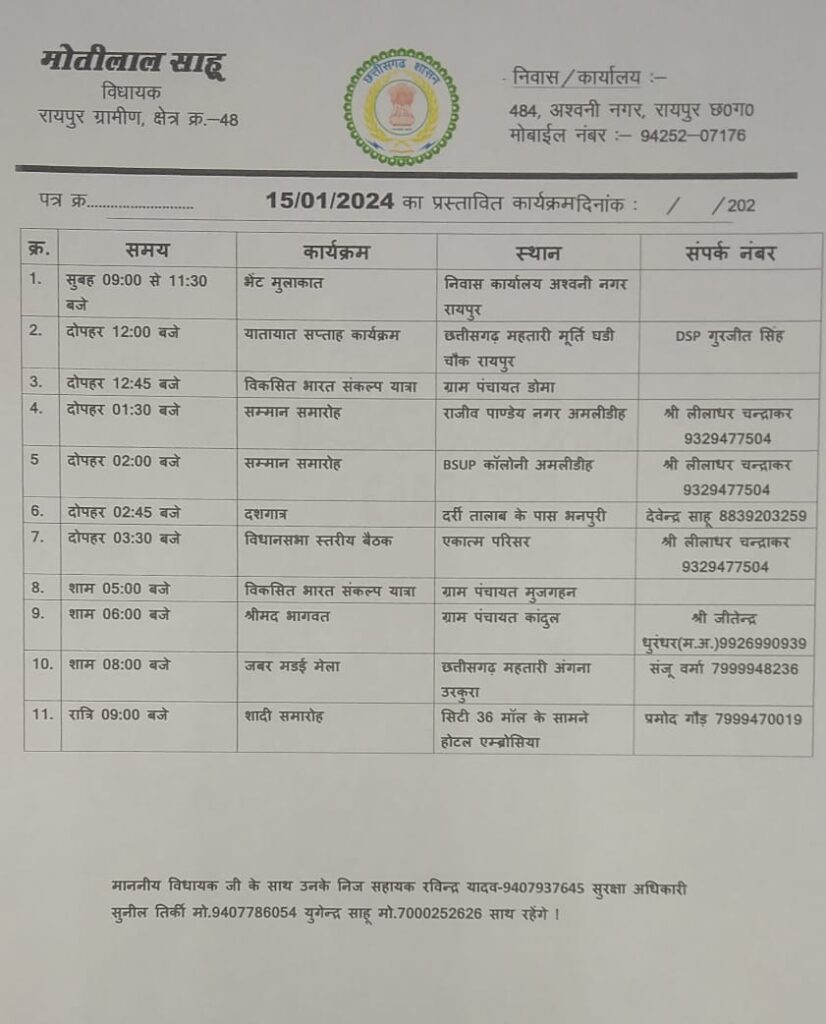 रायपुर ग्रामीण विधायक मोतीलाल साहू जी का मिनट टू मिनट का कार्यक्रम जाने रायपुर 15 January 2024satyakasamnaLeave a Comment on रायपुर ग्रामीण विधायक मोतीलाल साहू जी का मिनट टू मिनट का कार्यक्रम जाने Post Views: 65