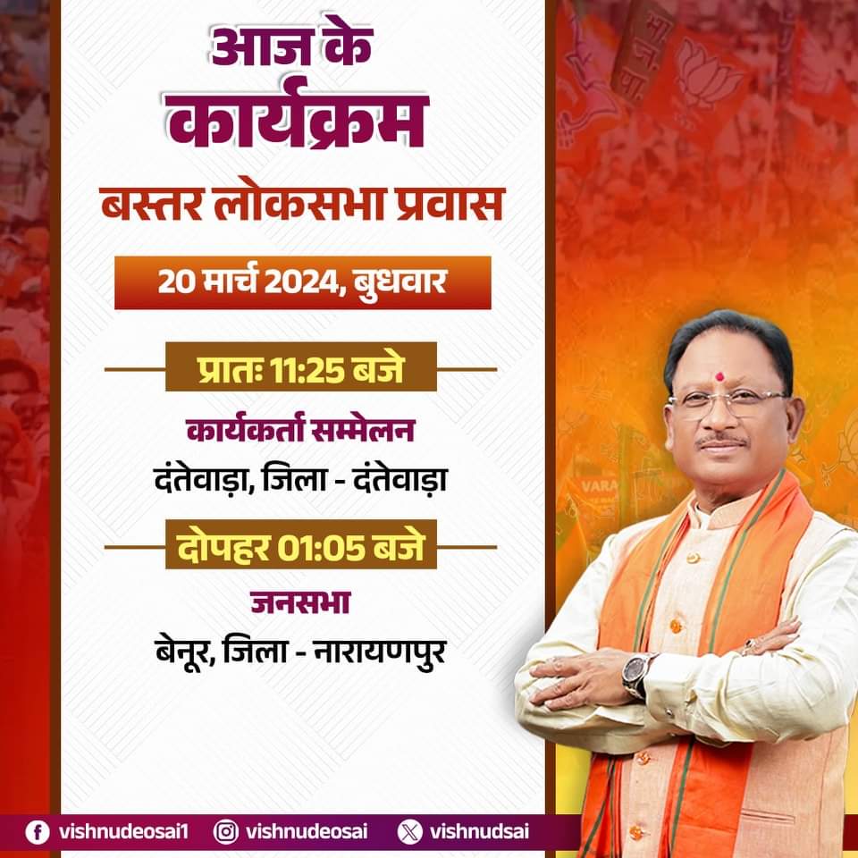 आज बस्तर दौरे में रहेंगे सीएम श्री विष्णुदेव साय दंतेवाड़ा में कार्यकर्ता सम्मेलन, नारायणपुर में जनसभा को करेंगे संबोधित… राजनीति 20 March 2024satyakasamnaLeave a Comment on आज बस्तर दौरे में रहेंगे सीएम श्री विष्णुदेव साय दंतेवाड़ा में कार्यकर्ता सम्मेलन, नारायणपुर में जनसभा को करेंगे संबोधित… छत्तीसगढ़: सत्य का सामना/सीएम विष्णुदेव साय जी का दौरा कार्यक्रम इस प्रकार है … Post Views: 43