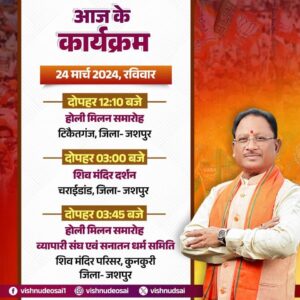 सीएम श्री विष्णुदेव साय आज अपने गृहजिले जशपुर में रहेंगे , मंदिर दर्शन एवं होली मिलन समारोह में करेंगे शिरकत….. राजनीति 24 March 2024satyakasamnaLeave a Comment on सीएम श्री विष्णुदेव साय आज अपने गृहजिले जशपुर में रहेंगे , मंदिर दर्शन एवं होली मिलन समारोह में करेंगे शिरकत….. राजधानी रायपुर:सत्य का सामना.. सीएम श्री विष्णुदेव साय जी आज अपने गृह जिले जशपुर के दौर में रहेंगे शिव मंदिर दर्शन एवं होली मिलन समारोह में करेंगे शिरकत…. Post Views: 60
