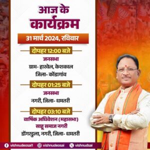 सीएम विष्णुदेव साय आज कोण्डागांव धमतरी के दौरे में रहेंगे जनसभा को करेंगे संबोधित, वार्षिक अधिवेशन में होंगे शामिल… छत्तीसगढ़ राजनीति 31 March 2024satyakasamnaLeave a Comment on सीएम विष्णुदेव साय आज कोण्डागांव धमतरी के दौरे में रहेंगे जनसभा को करेंगे संबोधित, वार्षिक अधिवेशन में होंगे शामिल… राजधानी रायपुर: सत्य का सामना/सीएम विष्णुदेव साय आज कोण्डागांव और धमतरी के जनसभा को करेंगे सम्बोधित,दोपहर 3 बजे वार्षिक अधिवेशन में होंगे शामिल… Post Views: 64
