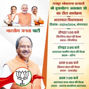 रायपुर लोकसभा प्रत्याशी बृजमोहन अग्रवाल आज भाटापारा विधानसभा के दौरे में रहेंगे, निपनिया, भाटापारा, एवम सिमगा मंडल के बैठक में होंगे शामिल…. राजनीति 2 April 2024satyakasamnaLeave a Comment on रायपुर लोकसभा प्रत्याशी बृजमोहन अग्रवाल आज भाटापारा विधानसभा के दौरे में रहेंगे, निपनिया, भाटापारा, एवम सिमगा मंडल के बैठक में होंगे शामिल…. भाटापारा:सत्य का सामना /रायपुर लोकसभा प्रत्याशी बृजमोहन अग्रवाल का दौरा कार्यक्रम.. Post Views: 66