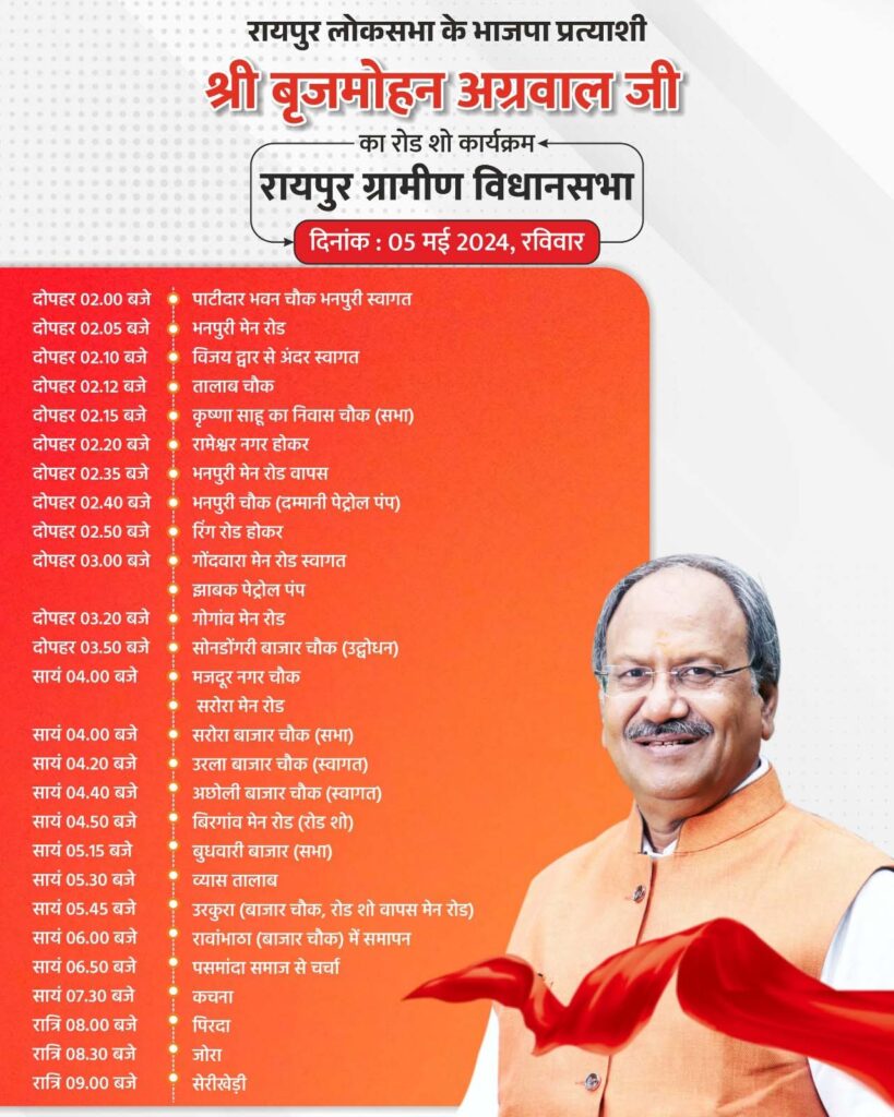 रायपुर लोकसभा प्रत्याशी बृजमोहन अग्रवाल का आज ग्रामीण विधानसभा में रोड शो, रोड शो दोपहर 2 बजे पाटीदार भवन से शुरू होकर रात 9 बजे जोरा चेरीखेड़ी में समाप्त होगी ….. राजनीति 5 May 2024satyakasamnaLeave a Comment on रायपुर लोकसभा प्रत्याशी बृजमोहन अग्रवाल का आज ग्रामीण विधानसभा में रोड शो, रोड शो दोपहर 2 बजे पाटीदार भवन से शुरू होकर रात 9 बजे जोरा चेरीखेड़ी में समाप्त होगी ….. राजधानी रायपुर/सत्य का सामना/कैबिनेट मंत्री रायपुर लोकसभा प्रत्याशी श्री बृजमोहन अग्रवाल जी का दौरा कार्यक्रम इस प्रकार है : Post Views: 64