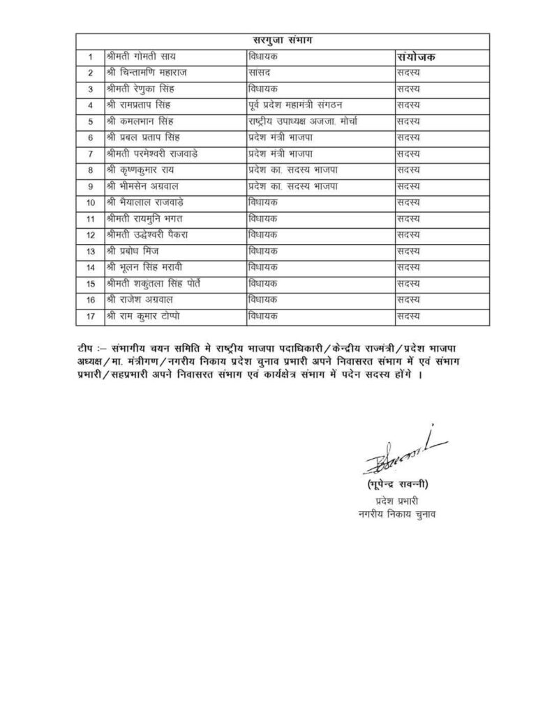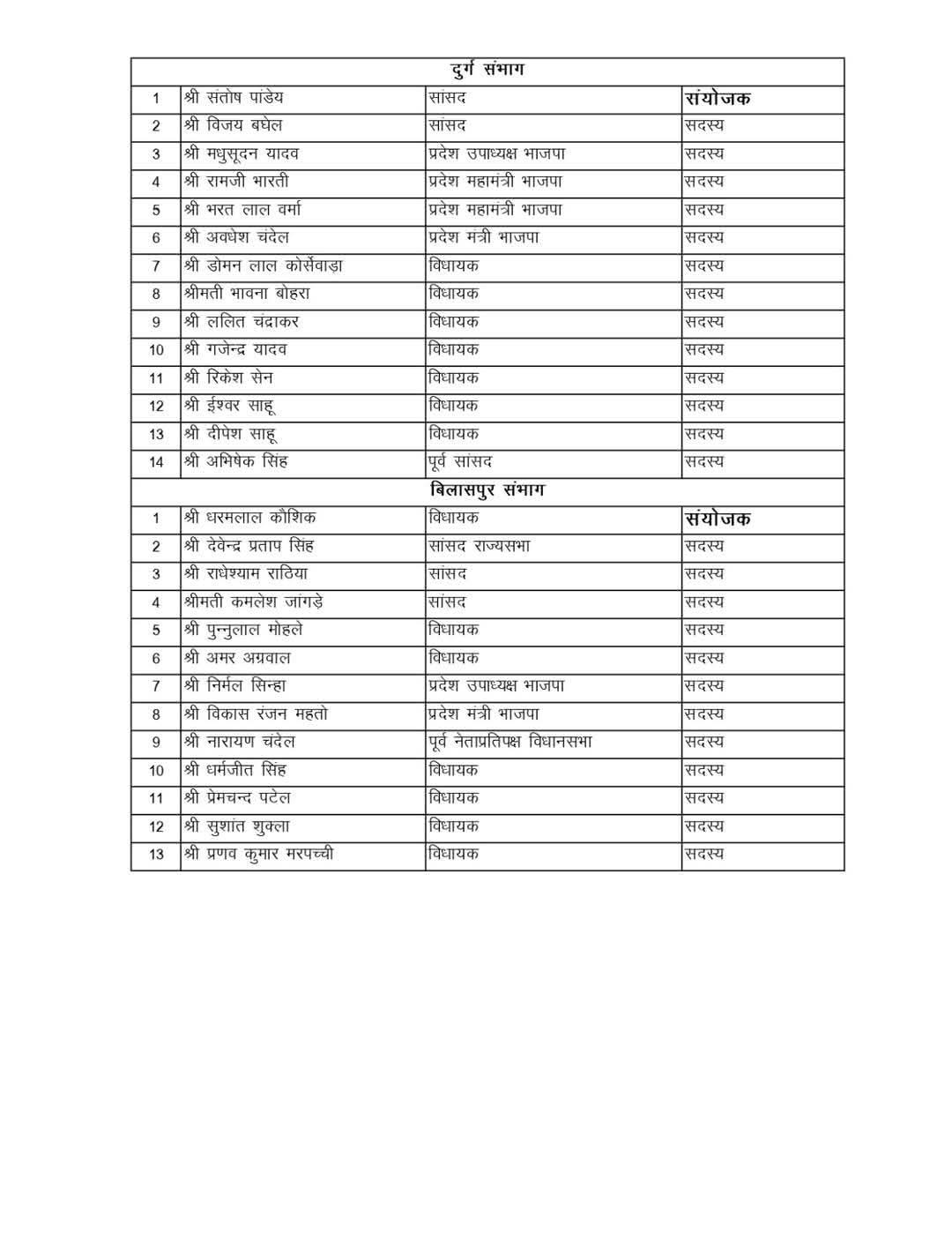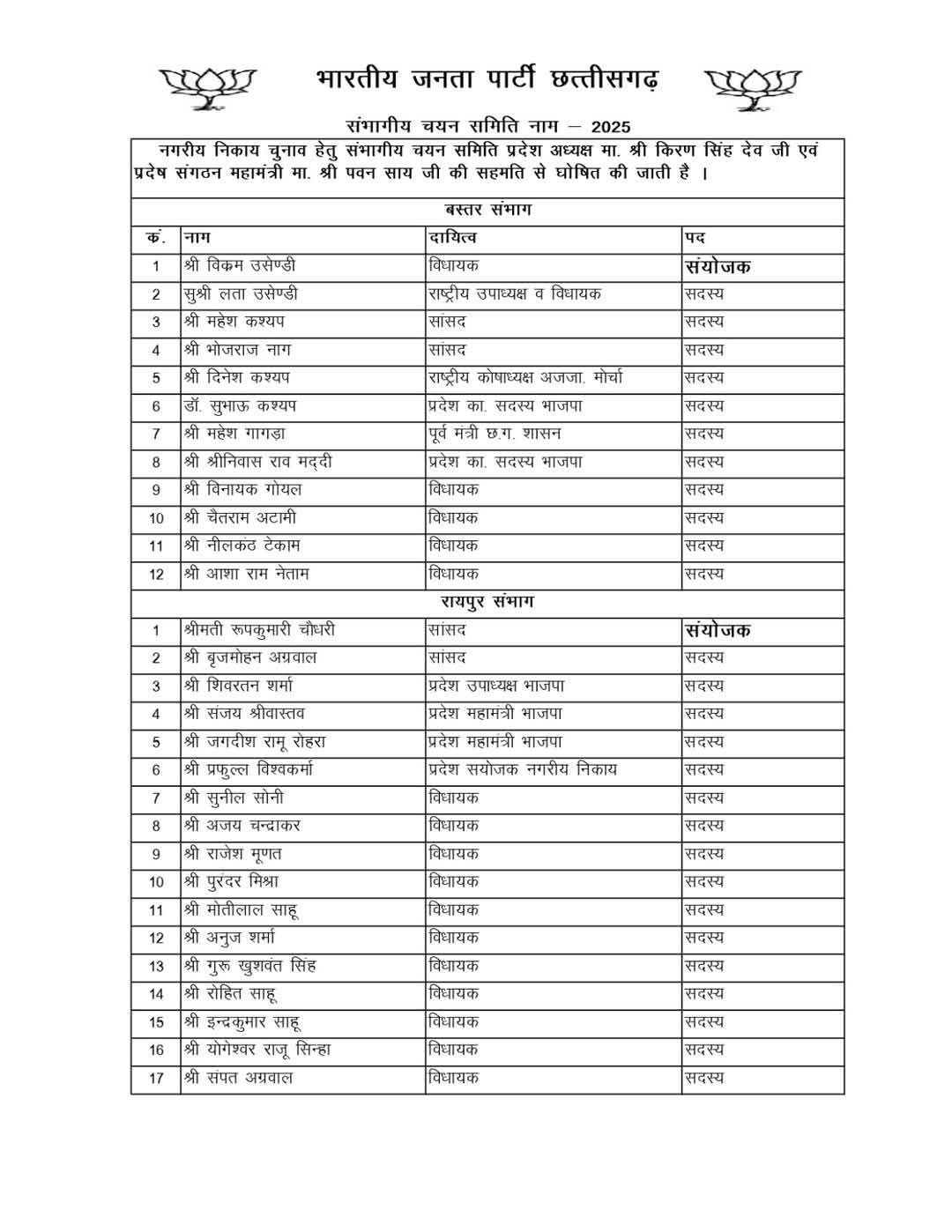 राजधानी रायपुर/सत्य का सामना/ छत्तीसगढ़ भारतीय जनता पार्टी ने नगरीय निकाय चुनाव को देखते हुए प्रदेश अध्यक्ष श्री किरण सिंह देव संगठन महामंत्री श्री पवन साय की सहमति एवं अनुशंसा पे संभाग स्तर पे संयोजक एवं सदस्यो की नियुक्ति की है , बस्तर संभाग से विधायक श्री विक्रम उसेंडी , रायपुर संभाग से सांसद श्रीमती रूपकुमारी चौधरी, दुर्ग संभाग से सांसद श्री संतोष पांडेय , बिलासपुर संभाग से विधायक श्री धरम लाल कौशिक एवं सरगुजा संभाग से विधायक श्रीमती गोमती साय को संयोजक नियुक्त किया गया है ….