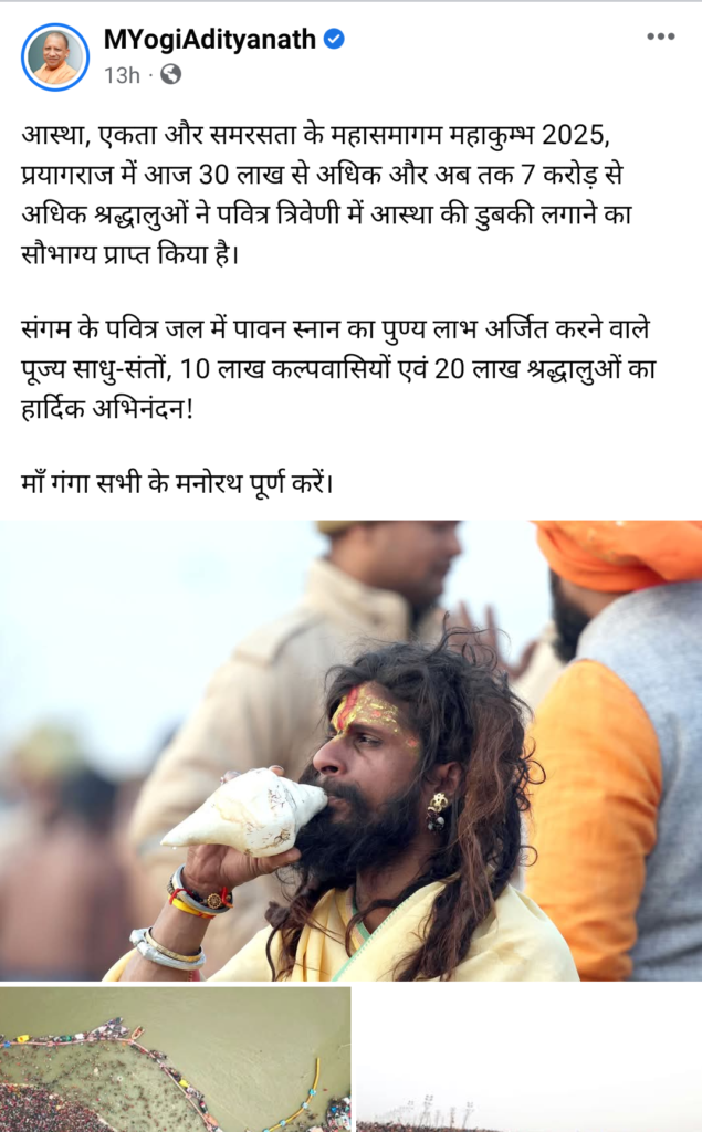 मुख्यमंत्री योगी आदित्यनाथ ने महाकुंभ में संगम में डुबकी लगाने वाले करीब 7 करोड़ श्रद्धालुओं का अभिनंदन किया है। योगी ने सोशल मीडिया पर जारी अपने संदेश में कहा कि आस्था, एकता और समरसता के महासमागम महाकुंभ, प्रयागराज में बृहस्पतिवार को 30 लाख से अधिक और अब तक 7 करोड़ से अधिक श्रद्धालुओं ने पवित्र त्रिवेणी में आस्था की डुबकी लगाने का सौभाग्य प्राप्त किया है। संगम के जल में पावन स्नान का पुण्य लाभ अर्जित करने वाले साधु-संतों, 10 लाख कल्पवासियों एवं 20 लाख श्रद्धालुओं का हार्दिक अभिनंदन मां गंगा सभी के मनोरथ पूर्ण करें।