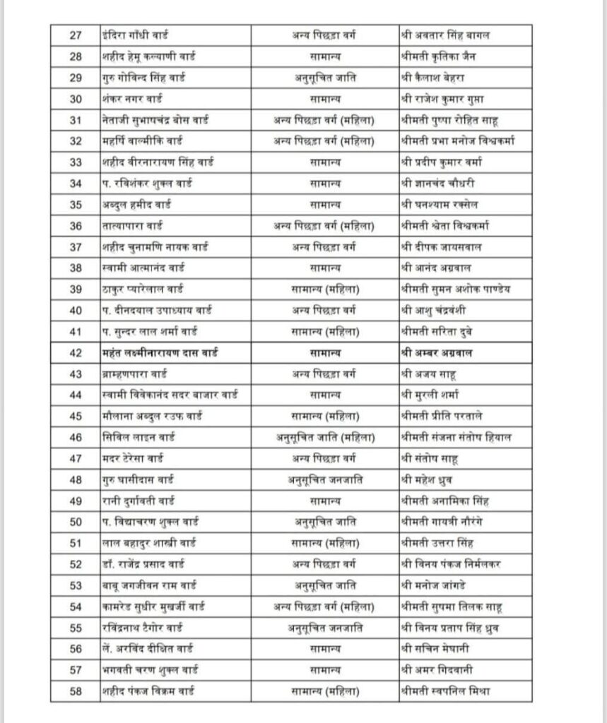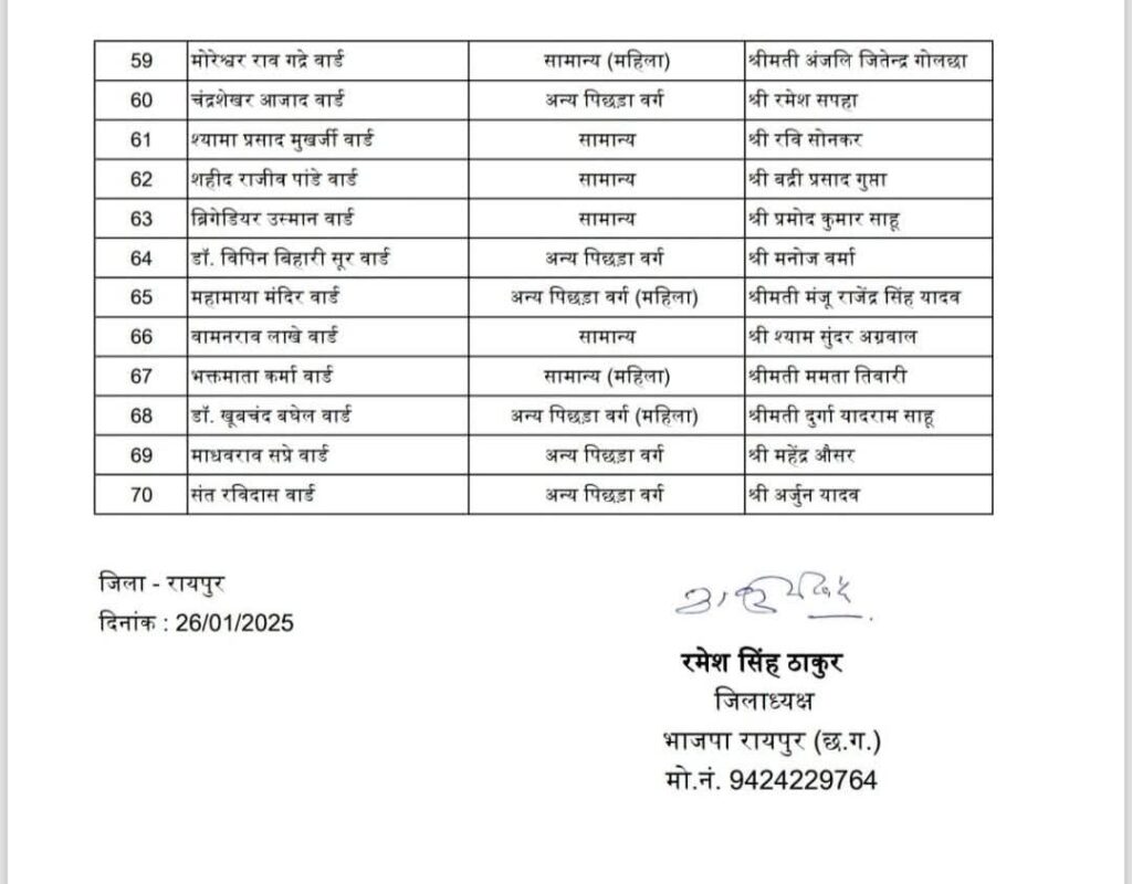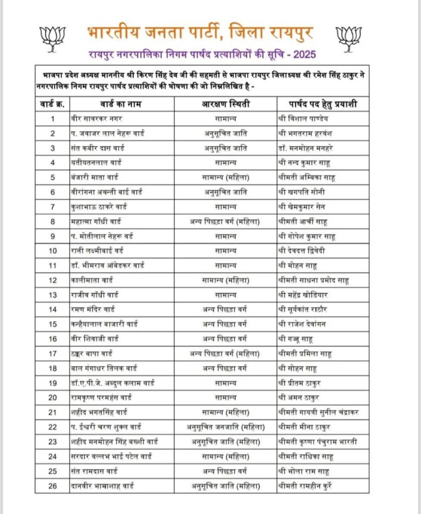 नगरीय निकाय छत्तीसगढ़ 2025 : कही मायूस चेहरे तो कहीं बांछे खिली, भाजपा ने घोषित की रायपुर नगर निगम के 70 उम्मीदवारों की सूची…. रायपुर राजधानी 26 January 2025satyakasamnaLeave a Comment on नगरीय निकाय छत्तीसगढ़ 2025 : कही मायूस चेहरे तो कहीं बांछे खिली, भाजपा ने घोषित की रायपुर नगर निगम के 70 उम्मीदवारों की सूची…. राजधानी रायपुर/सत्य का सामना/ छत्तीसगढ़ भारतीय जनता पार्टी ने आगामी नगरीय निकाय चुनाव 2025 हेतु रायपुर नगर पालिक निगम के अंतर्गत 70 वार्डो के प्रत्याशियों की सूची जारी कर दी है जो इस प्रकार है : Post Views: 60