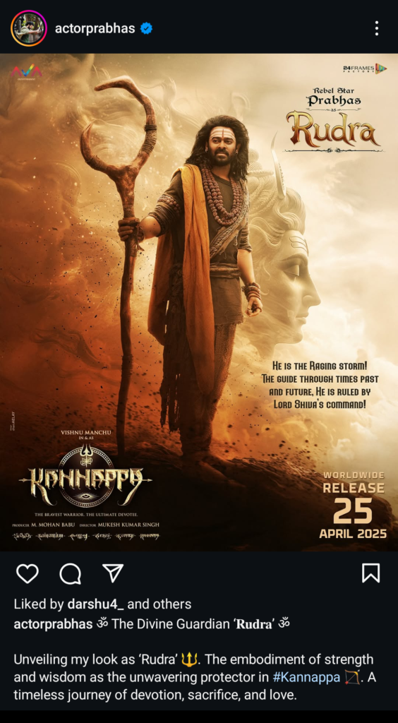 दरअसल, प्रभास ने अपने इंस्टाग्राम पर कन्नप्पा का पोस्टर शेयर किया है। जिसमें वह लंबे बाल, माथे पर त्रिपुंड, गले में रुद्राक्ष की माला पहने नजर आ रहे हैं। वहीं उन्होंने फर्स्ट लुक शेयर करते हुए कैप्शन लिखा कि ”ॐ दिव्य संरक्षक ‘रुद्र’ॐ. ‘रुद्र’के रूप में अपने लुक का अनावरण। कन्नप्पा में अडिग रक्षक के रूप में शक्ति और ज्ञान का अवतारय भक्ति, त्याग और प्रेम की एक कालातीत यात्रा। फिल्म 25 अप्रैल को सिनेमाघरों में रिलीज होगी।”