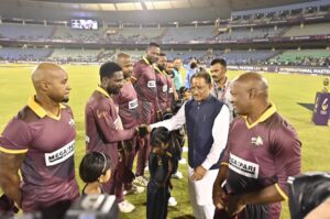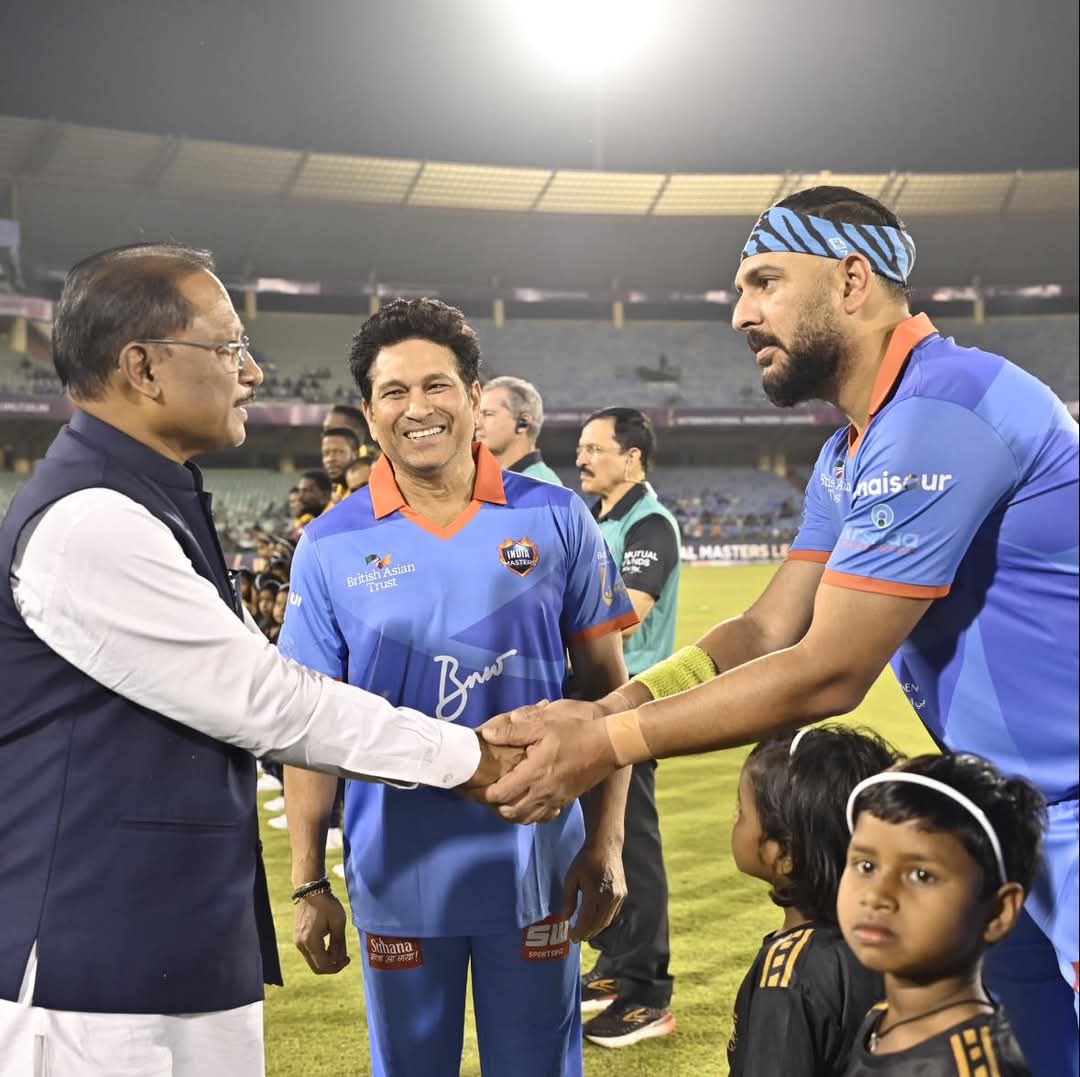 राजधानी रायपुर /सत्य का सामना / राजधानी रायपुर के शहीद वीर नारायण सिंह अंतरराष्ट्रीय स्टेडियम मे आयोजित इंडिया मास्टर्स और वेस्टइंडीज मास्टर्स के बीच आयोजित मैच मे लीग मैच मे पहुचे मुख्यमंत्री श्री विष्णुदेव साय, उन्होंने बारी बारी से भारत और वेस्टइंडीज के खिलाड़ियों से मुलाक़ात की और उन्हें जीत की बधाई एवं शुभकामनायें दी….